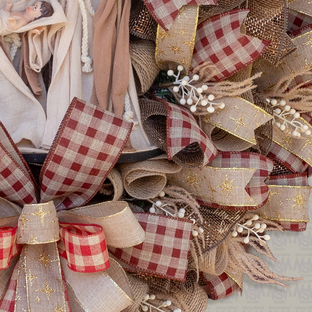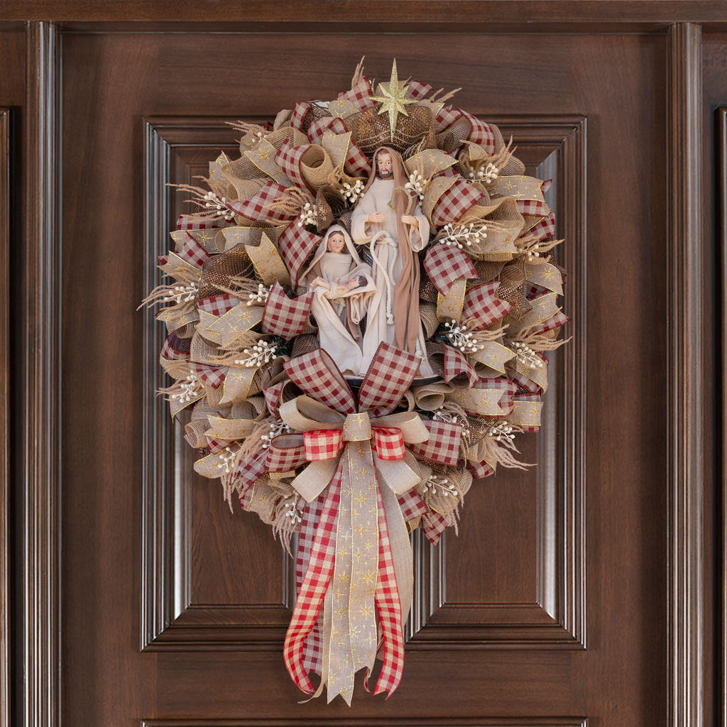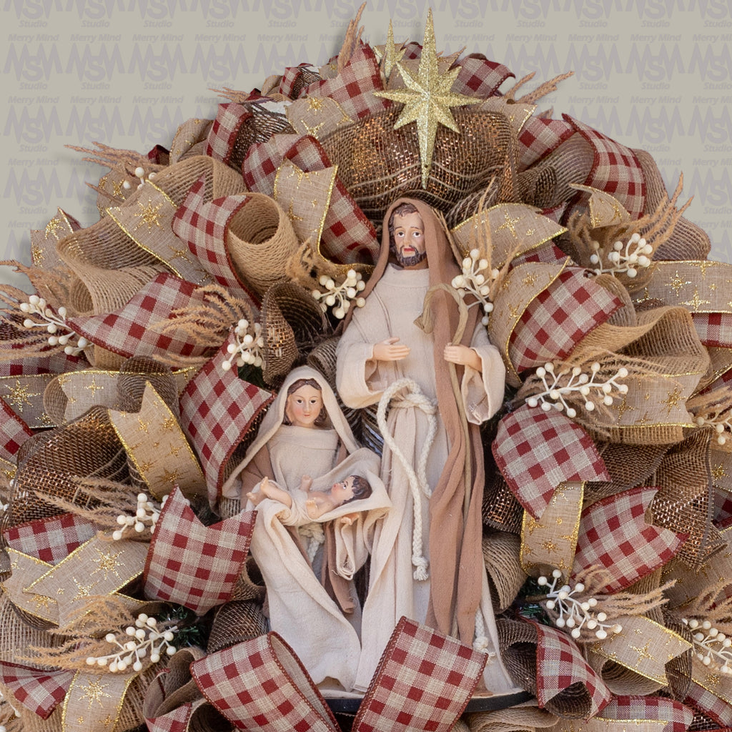 In the heart of the wreath, a wonderful nativity scene takes center stage. The figures, Mary, Joseph, and baby Jesus, are lovingly detailed. The figures are molded and clothed, radiating warmth and reverence. Above their heads is a gold star of the East, and Surrounding them is the soft glow from hidden remote controlled bead lights, emphasizing the sacredness of the moment.